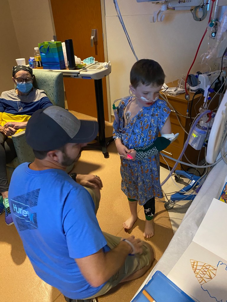 Thankfully they were able to see us right away, and they acknowledged his numbers were concerning. They had me give him more albuterol and waited, then took a reading. The numbers were still low, so we repeated the albuterol/wait method with the same non-effect. The next step was to try a different oral steroid which the doctor said some kids can tolerate better, and thankfully he did keep it down, but again his numbers didn’t stabilize. After that they wheeled in an oxygen tank and gave him 10 minutes of oxygen. His oxygen saturation went up to 96, but it dropped back into the 80s after he was taken off. They tried that one more time with the same result, and at that point they said, “He may need hours of oxygen, it is probably the best idea to go to a pediatric ER.” So they sent me with the appointment notes and I drove over to the children’s ER at St. David’s and had Eric meet me there.