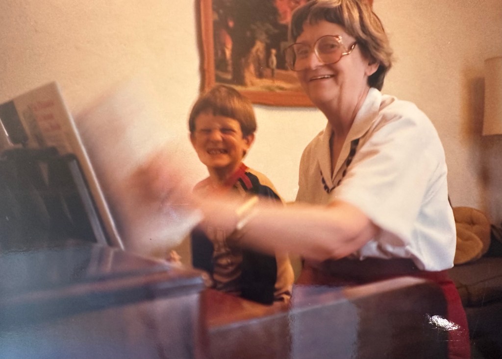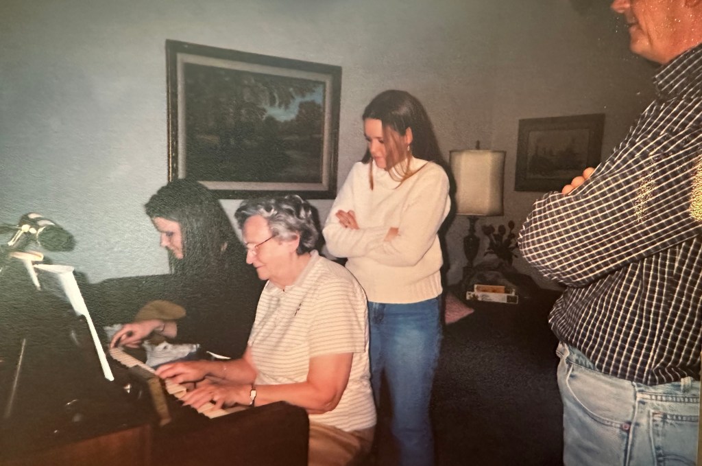 My grandma was very musical, she played the flute and the piano, and could read music and sing. She played flute in the band at Baylor University where she majored in voice. My sister Katheryn and I always loved playing piano together with Grandma. She taught us “Heart and Soul” and “Chopsticks” and another song I can never remember the name of but I could play it for you even now. When I grew up and had kids of my own, they also got to play the piano with great Grandma and I cherish that for them.