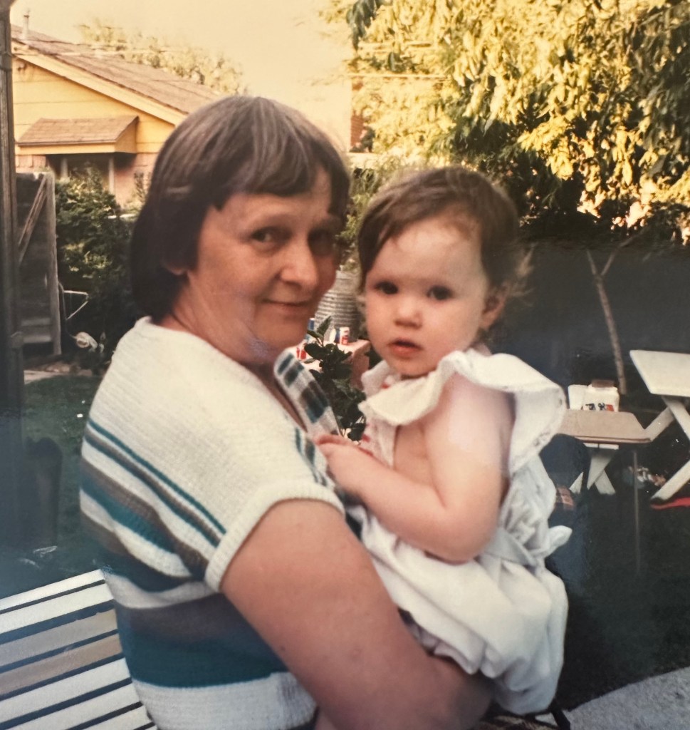 My grandma was always such a warm and loving person to me, she always had a sunny smile for me and fun and interesting conversation. I grew up in South Texas so I didn’t get to come up to Seymour very often, usually just for Thanksgiving. It was a seven hour drive and we’d always arrive late at night or in the wee hours of the morning. When you cross that much of Texas, everything changes; the culture, the climate even. I knew when we were getting close to Grandma’s house because the temperature would drop considerably and we’d start seeing bundled Christmas trees for sale stacked up against the walls of every Allsup’s (they don’t have Allsup’s down south, or if they do, they didn’t in the 90’s) We’d pull into the driveway and try (unsuccessfully) to make minimal ruckus as we exited the car with two adults, four kids and roughly 70 suitcases. Grandma would always come out and greet us, give us hugs and make sure we were tucked in tight. Thanksgivings in Seymour were always a big family affair, with lots of cooking, lots of yelling at the Dallas Cowboys on TV, and lots of outside time watching my brothers Steven and Brian, toss around a football with my uncles Jimmy and Tommy, and my cousin Glenn, or collecting pecans from the big tree in the back yard of Grandma’s house with my sister Katheryn. My Grandma made a stellar pecan pie, and “pink stuff” (as we called it – she called it “ambrosia”). Sometimes at meal times (not holiday meals) she’d sarcastically admonish us, “Yall don’t ruin my good china,” as she handed us paper plates and napkins. She had a great sense of humor.